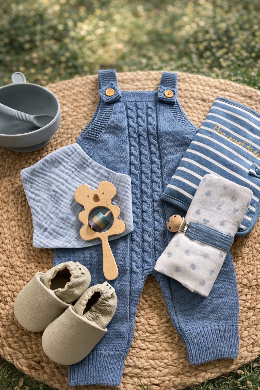 ce coffret unique comprend une combinaison en maille toute douce et ses accessoires qui feront le plaisir de futurs parents.