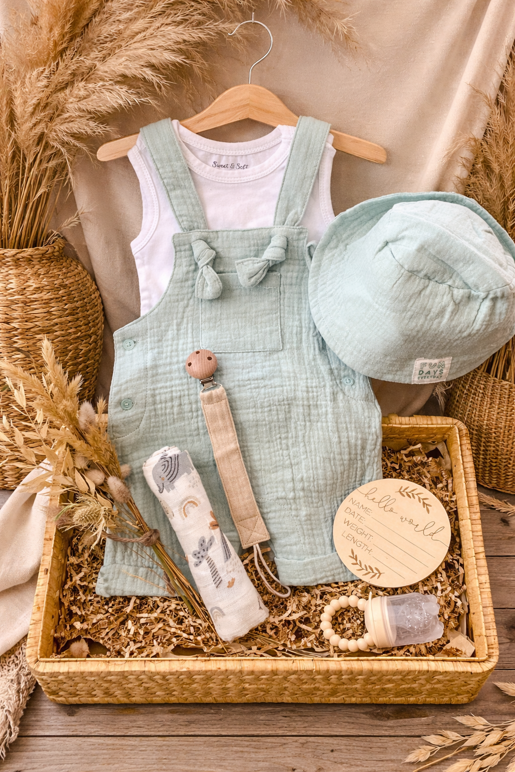 Ce coffret est composé d'une salopette, d'un body et son chapeau en gaze de coton, idéal pour la période estivale insi qu'une attache tétine.