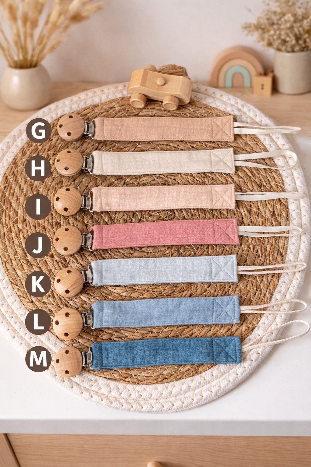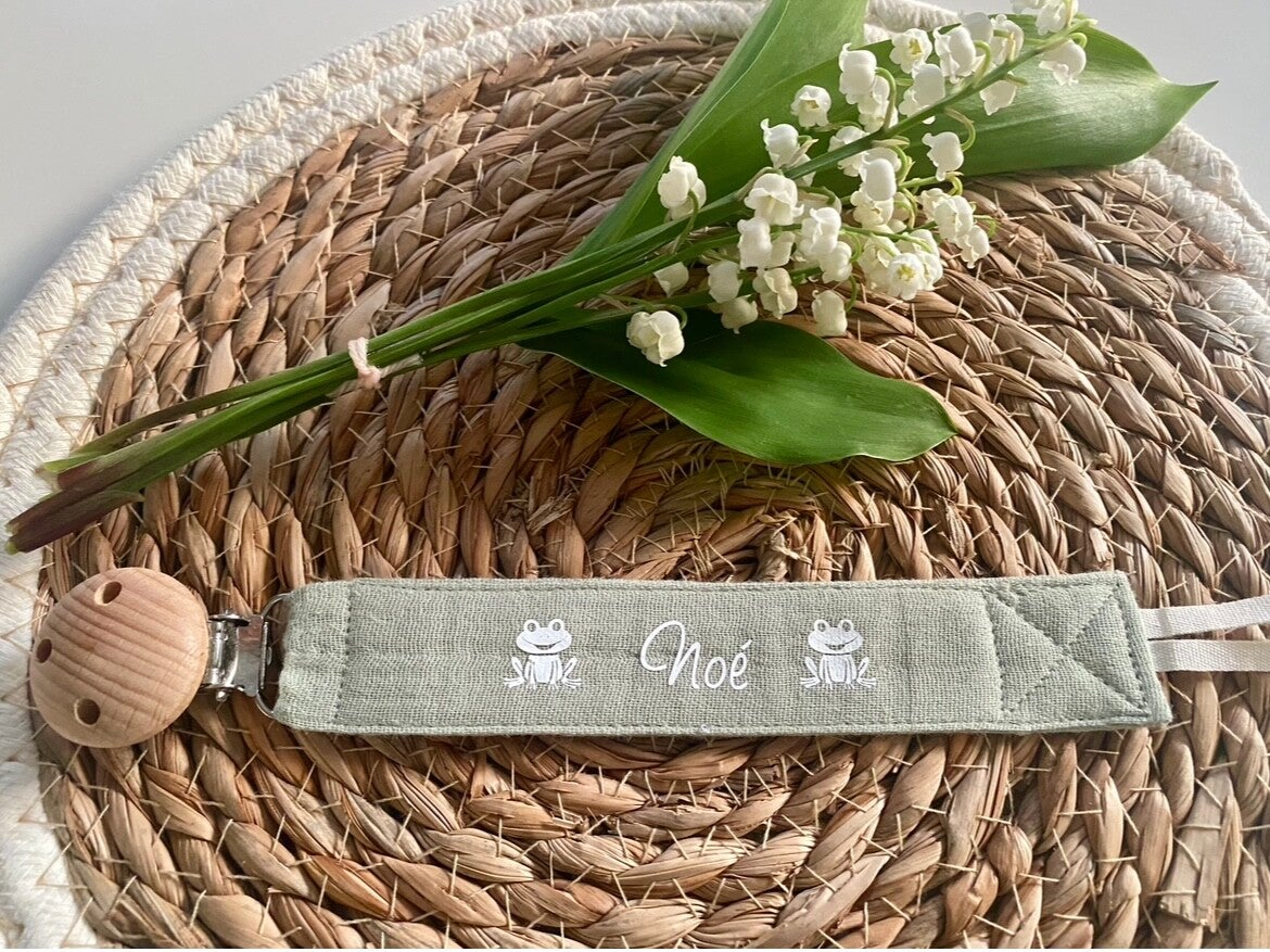 Attache tétine en gaze de coton personnalisable au prénom de bébé.